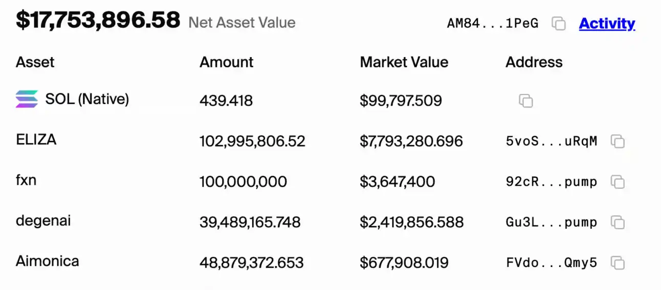 目前,ai16z 的净资产价值(NAV)为 1770 万美元,主要由其持有的 ELIZA Token、degenai 和 fxn 组成。这意味着 ai16z Token(当前价格为 0.80 美元)以其 NAV 的 50 倍溢价交易,乍看之下似乎有些不合理。