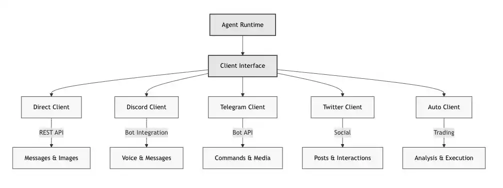 ELIZA 的客户端架构简化了平台特定实现的复杂性。通过一个标准化的接口,开发者可以以最少的额外代码在 Discord、X、Telegram 和自定义 REST API 端点上部署他们的 AI 智能体。每个客户端包都针对其相应的平台进行了定制,能够无缝管理 Discord 的语音频道集成、Twitter 的帖子调度和 Telegram 的消息系统等功能。