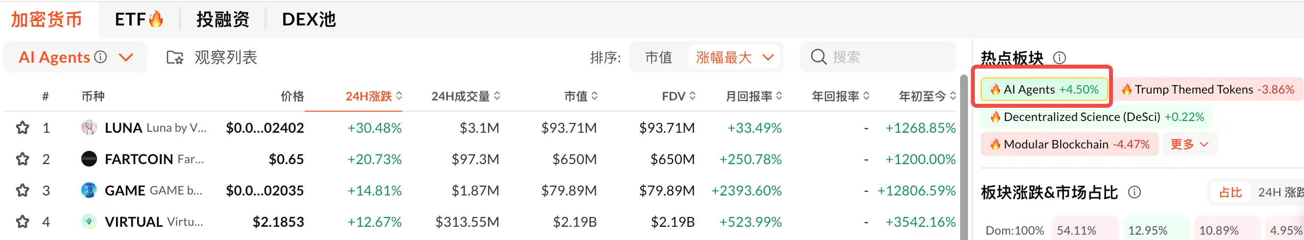 首先从整个市场大盘来看,AI Agent 最近一两周必然还是热门赛道。尤其是昨天 OKX 上线 GOAT 现货,又带动了整个 AI Agent 赛道的热情。
