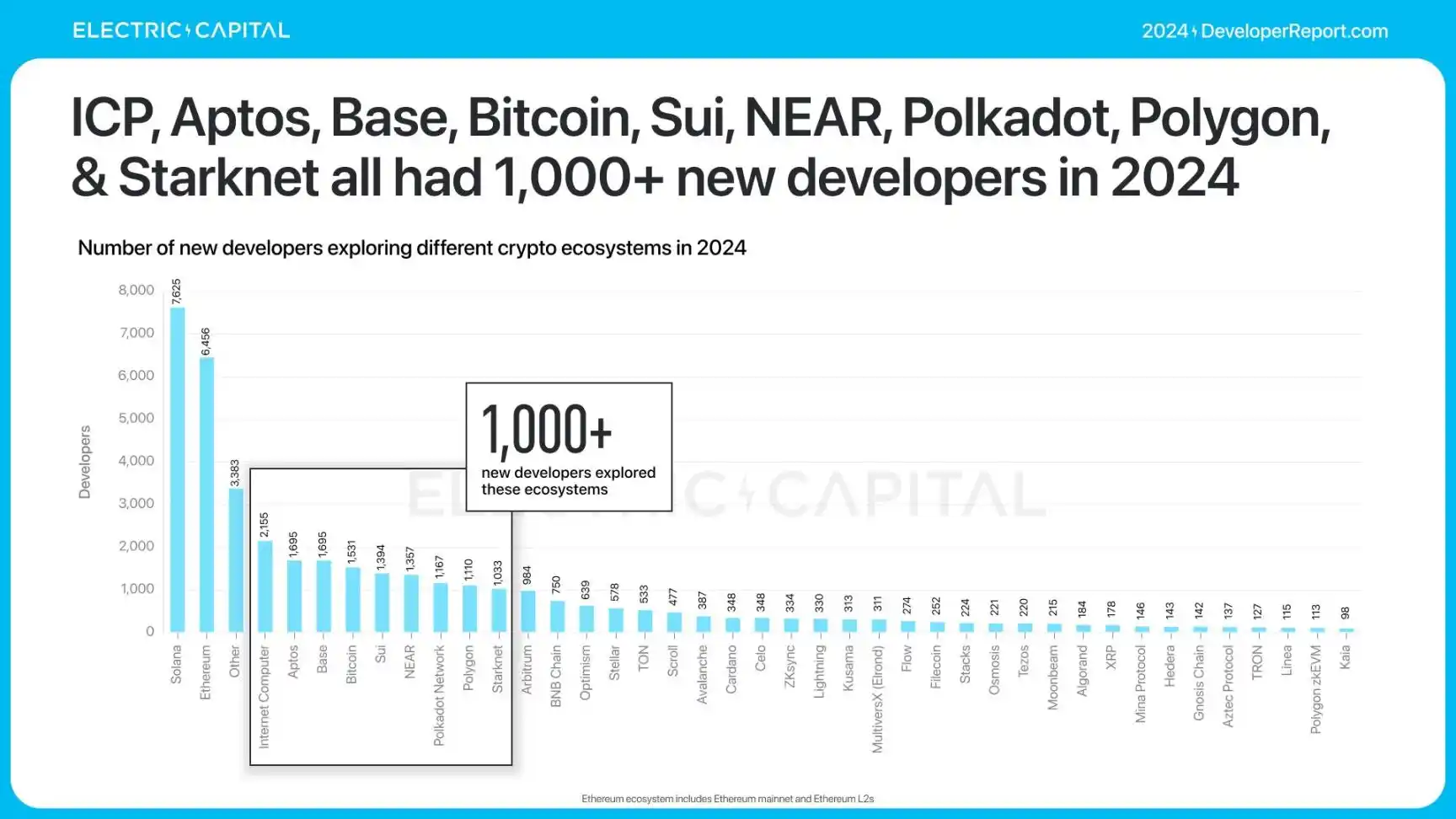 以太坊排名第二。dfinity、Aptos、Base、比特币、SuiNetwork、NEAR Protocol、Polkadot 、Polygon 和 Starknet 都有超过 1,000 位新开发者加入。