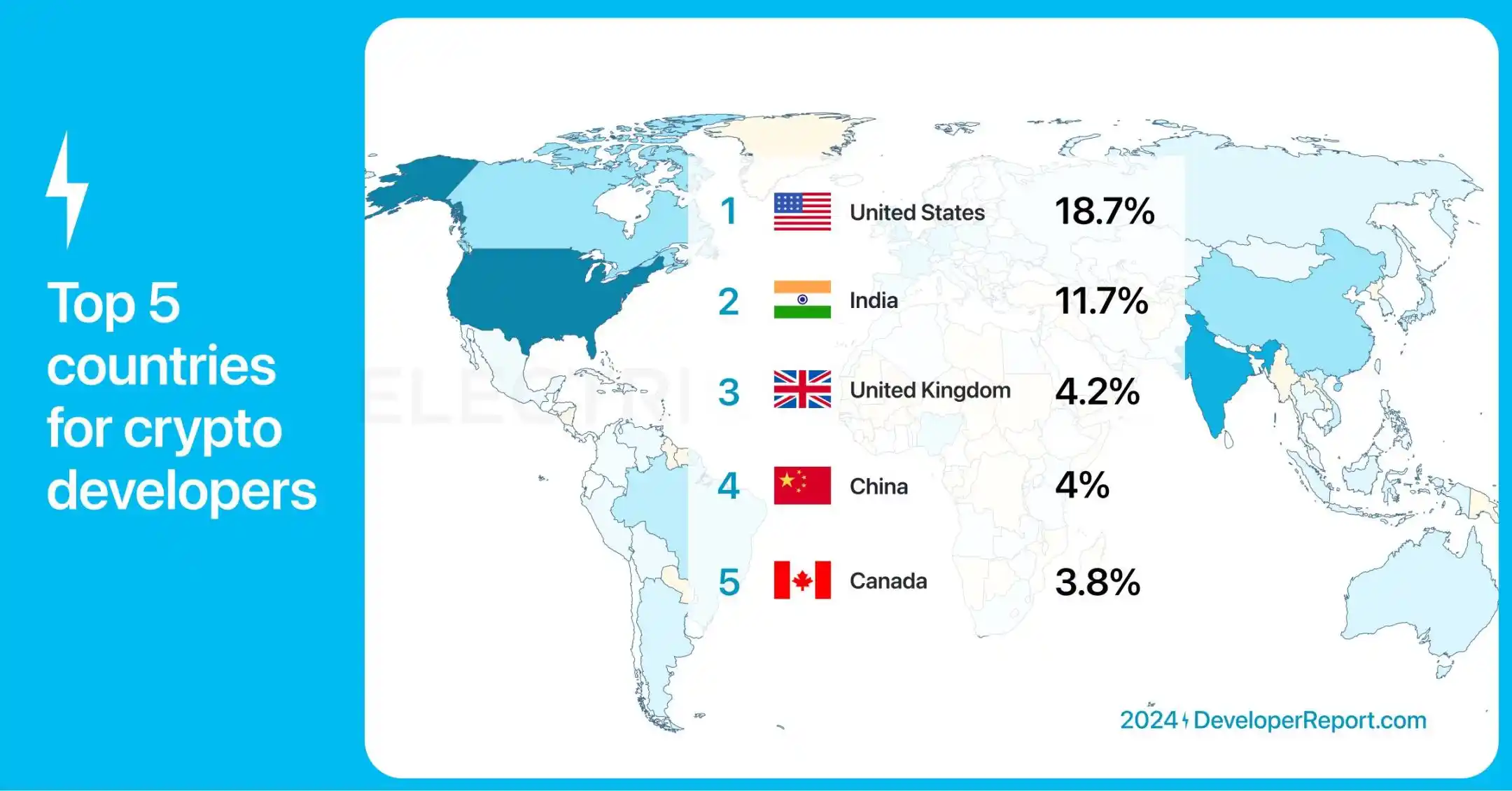 美国、印度、英国、中国和加拿大在全球加密开发者中占据了最大份额。