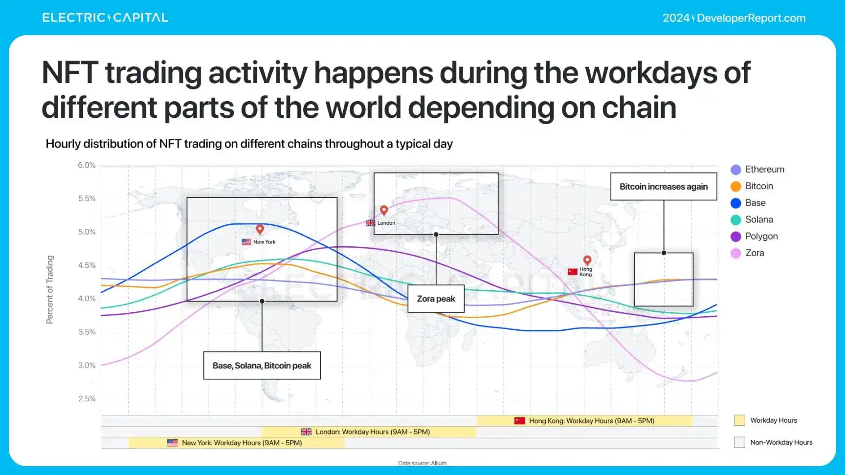 NFT 铸造和交易的交易量在不同地区达到峰值——这表明存在不同的用户群体。