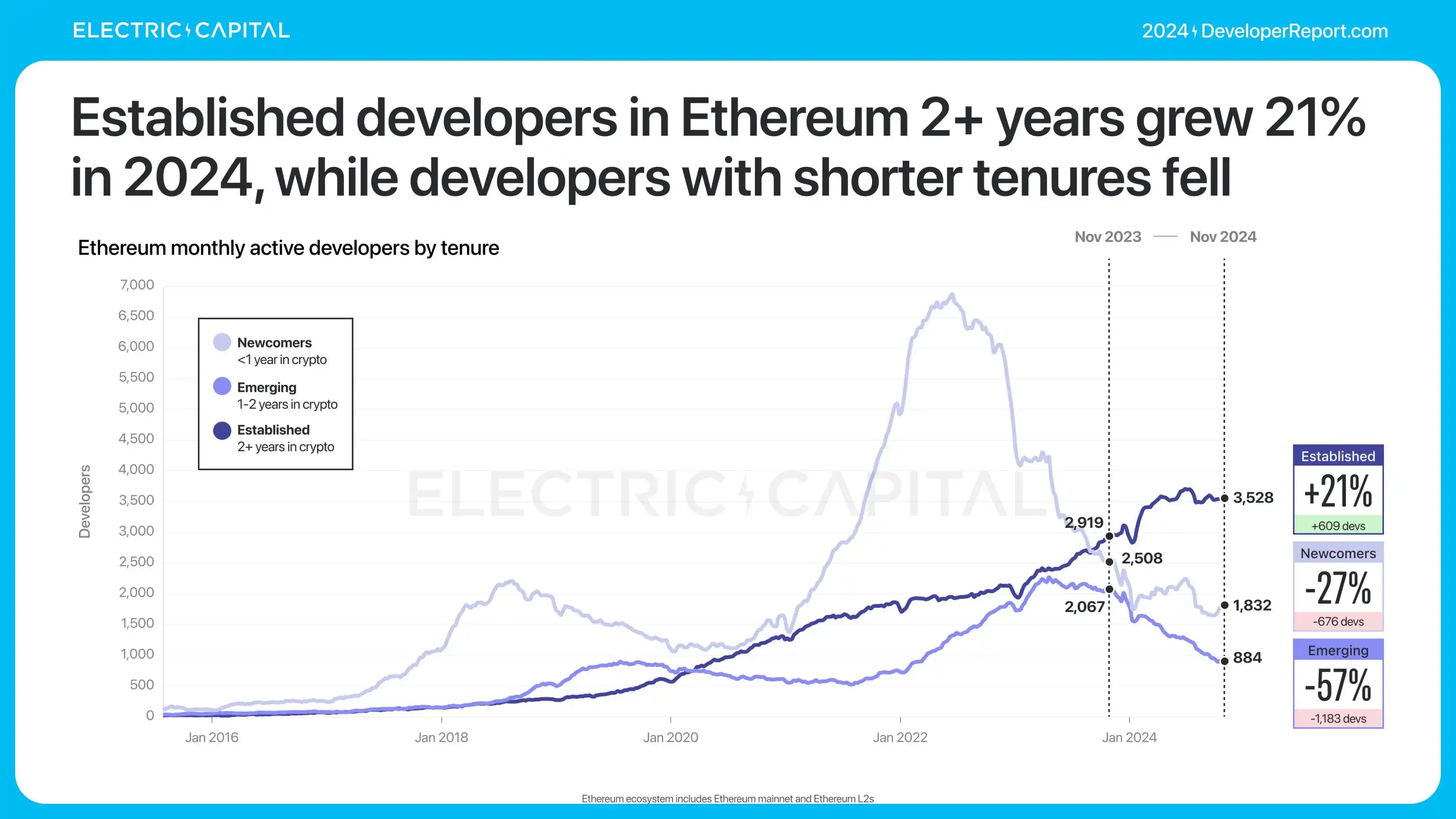 大部分损失来自于 2021 年之后加入的开发者。已经在以太坊工作的开发者中,超过 2 年的开发者增长了 21%。