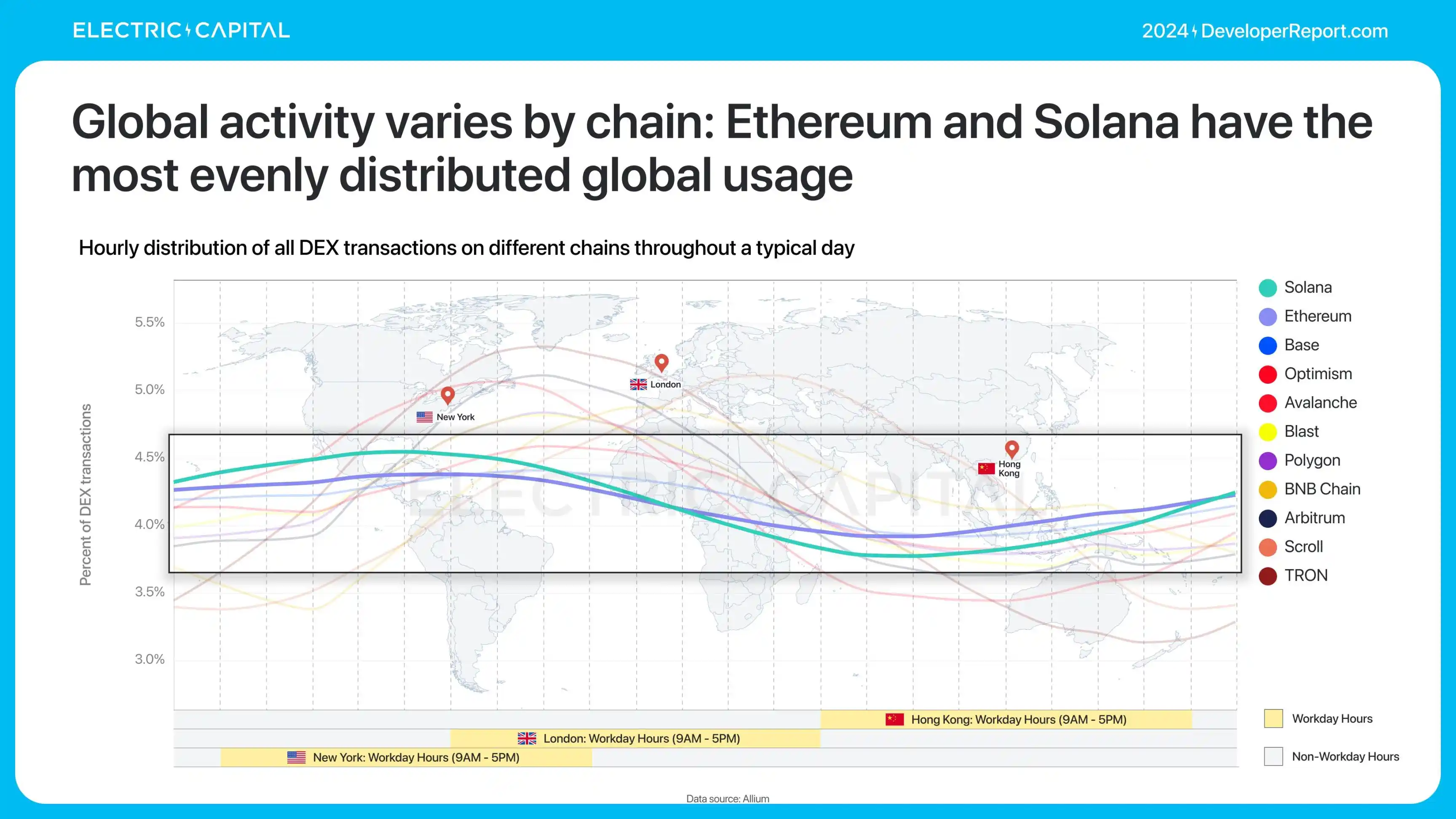 全球活动在不同链上的分布有所不同——活动分布越均匀,说明使用越具全球性。以太坊和 Solana 的使用分布最为均匀。