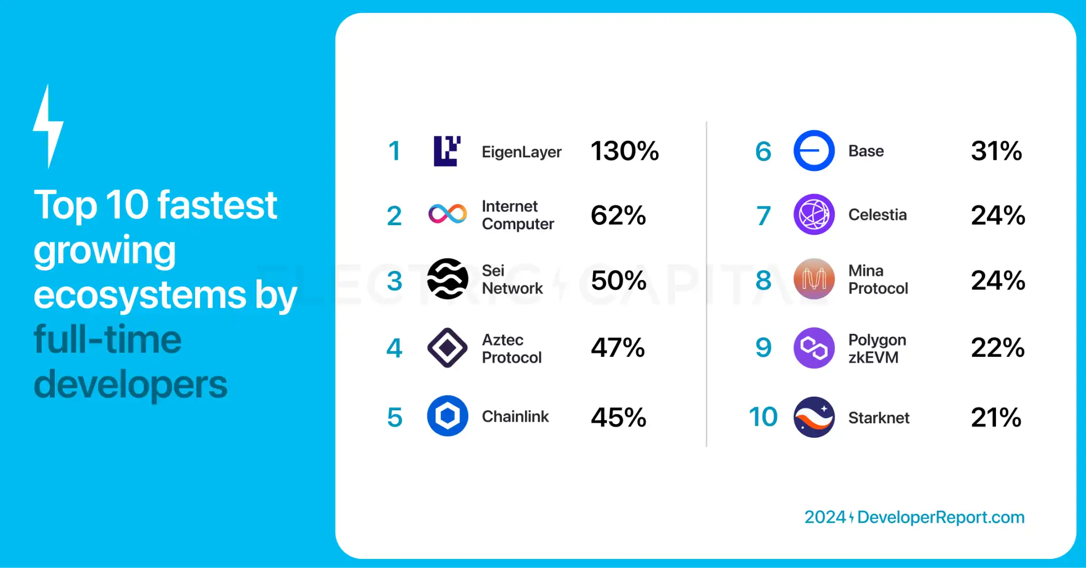 根据 2023 年第三季度和 2024 年第四季度的数据,全职开发者增长最快的十大生态系统是: