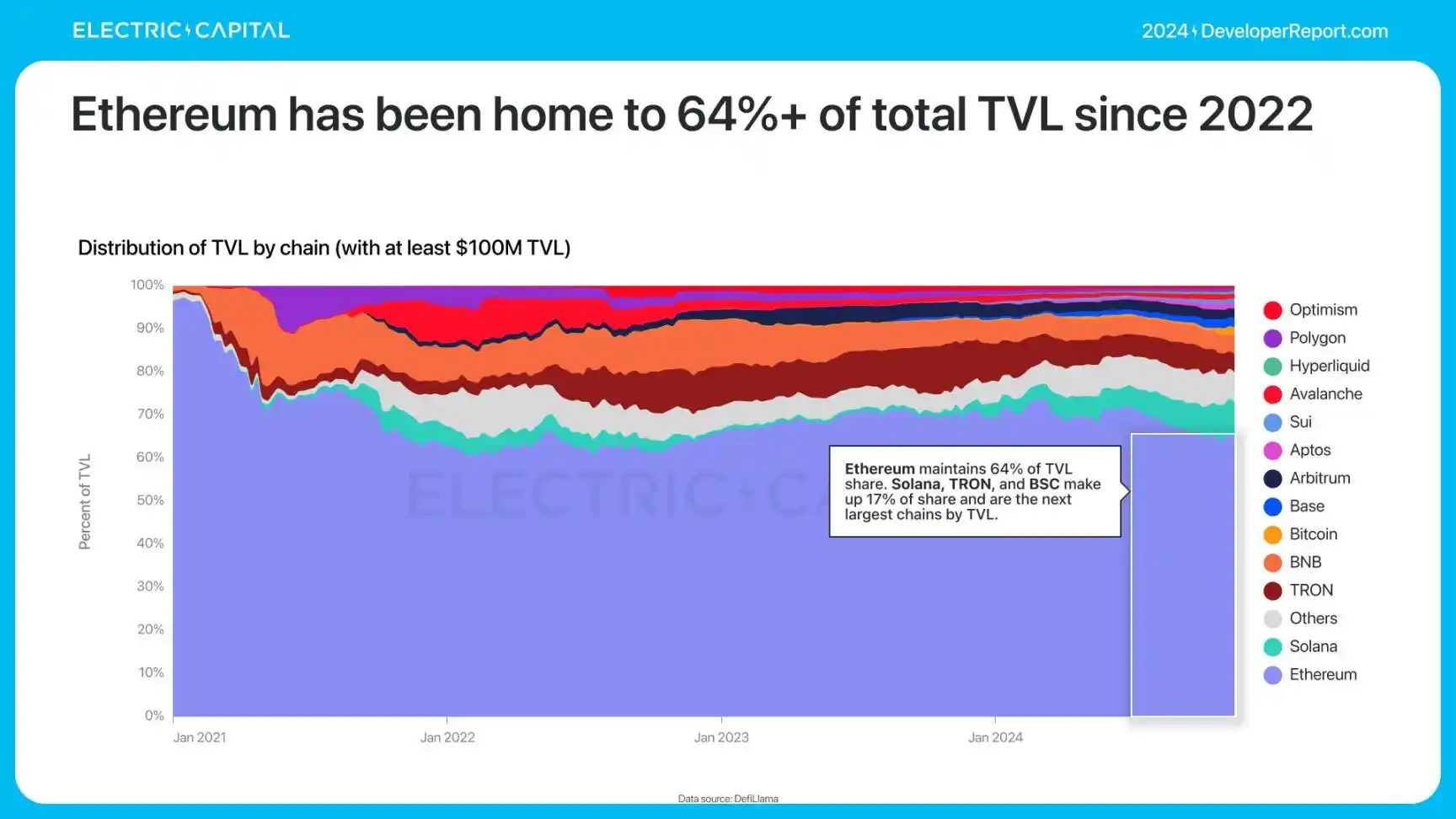 以太坊的 TVL 占据主导地位,是第二大链的 7 倍。