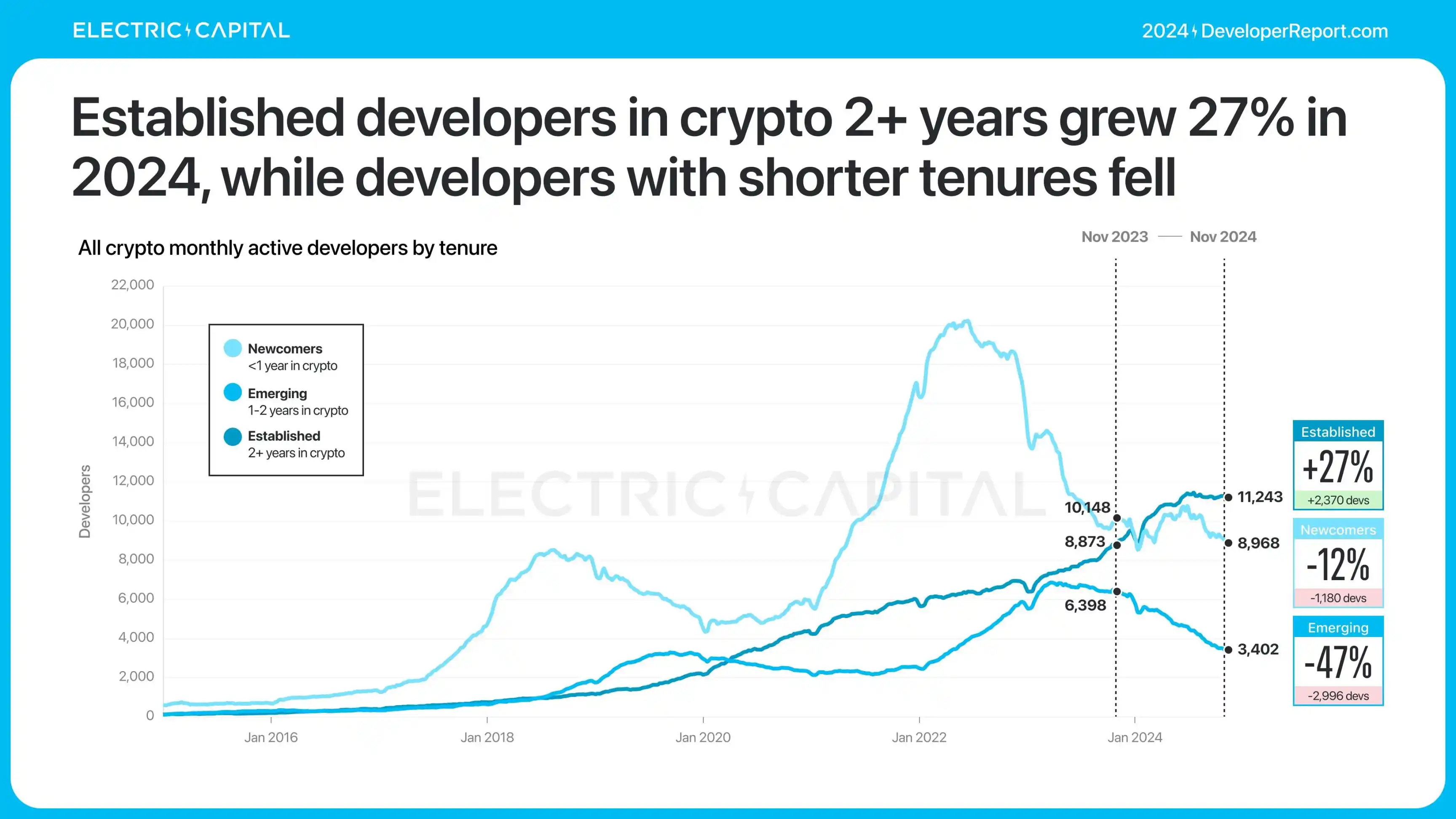 然而,从事加密行业超过两年的开发者数量增长了 27%。
