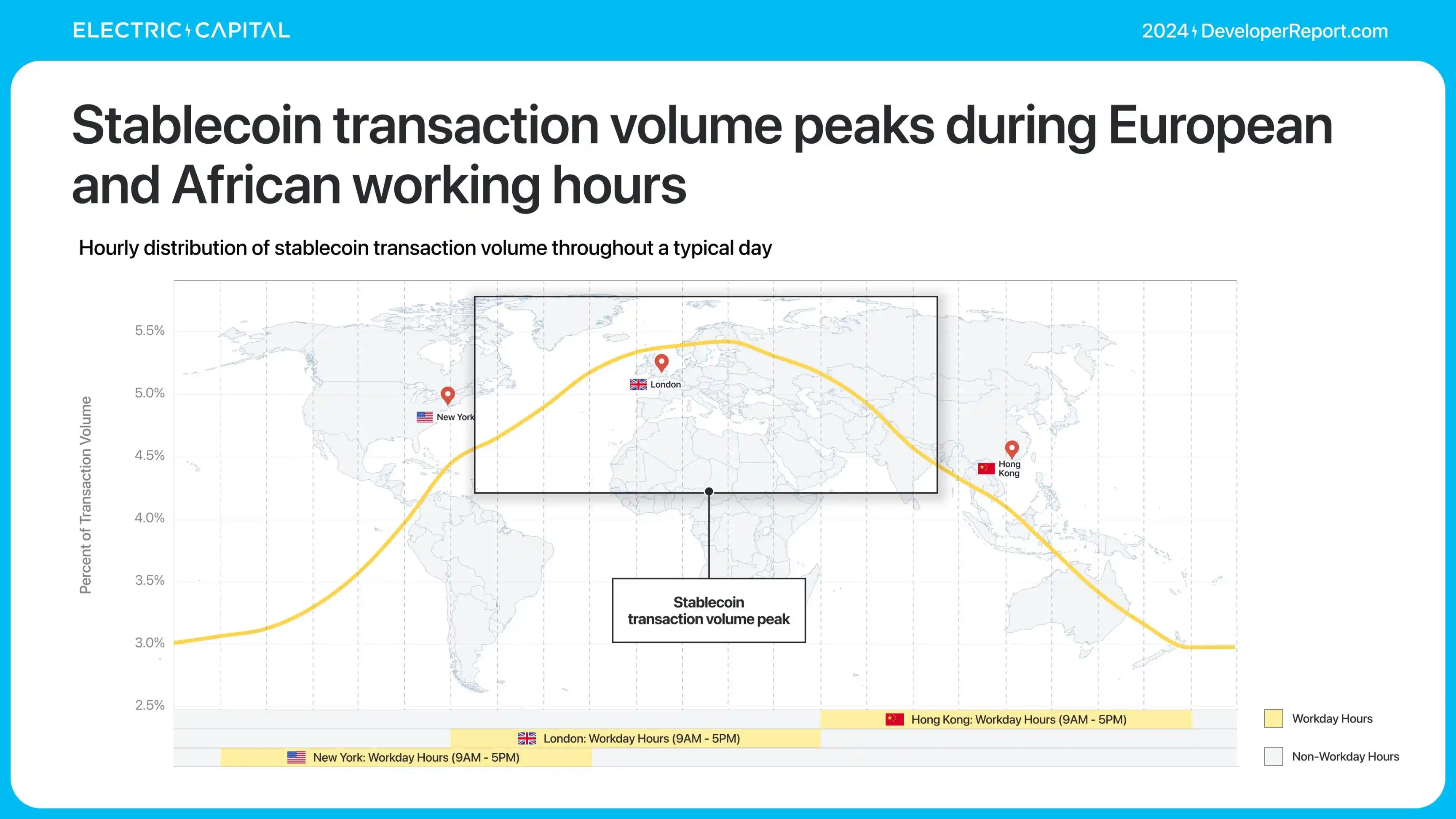 尽管稳定币交易在东半球的工作时间内达到峰值,但交易量更倾向于西半球。