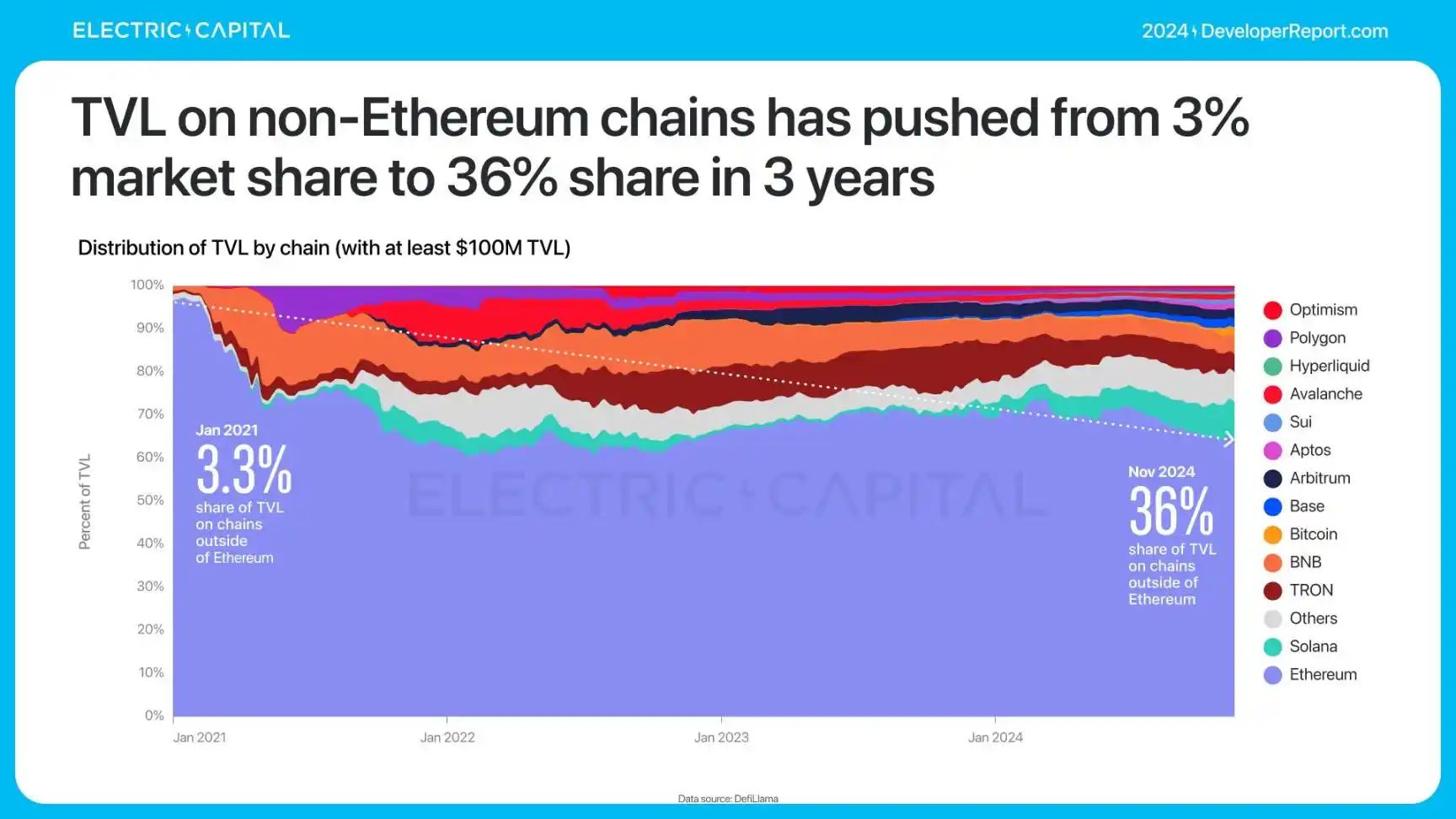 非以太坊的 TVL 在 3 年内从 3% 增长到了 36%。