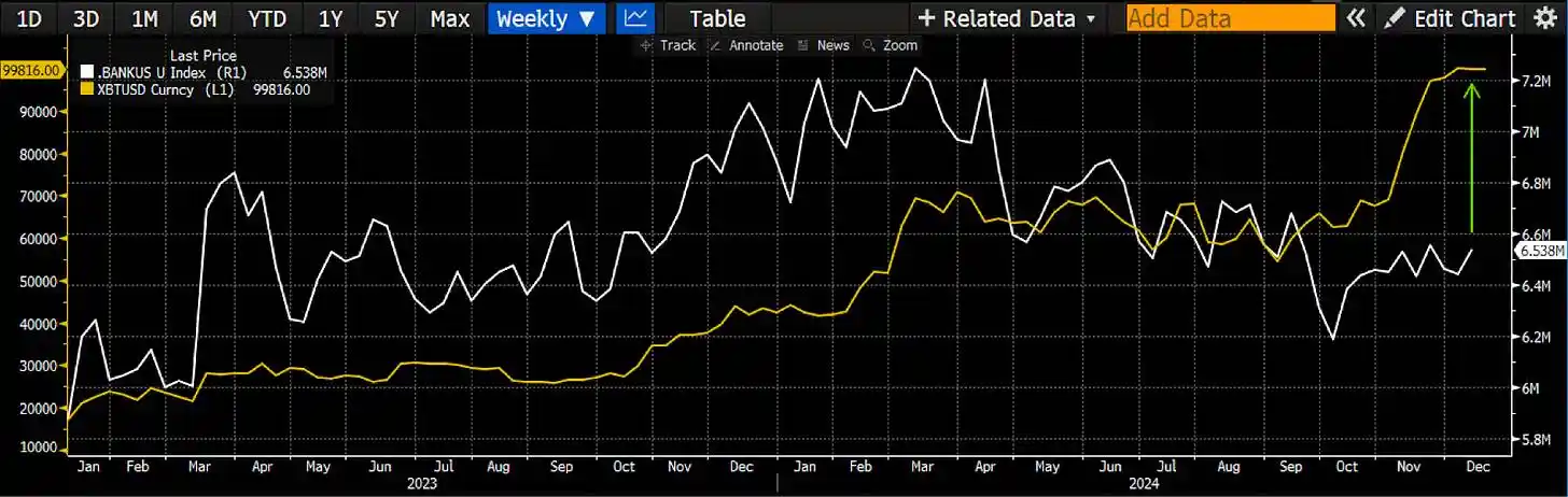 比特币(黄色线)正在推动美国银行信贷(白色线)的增长。