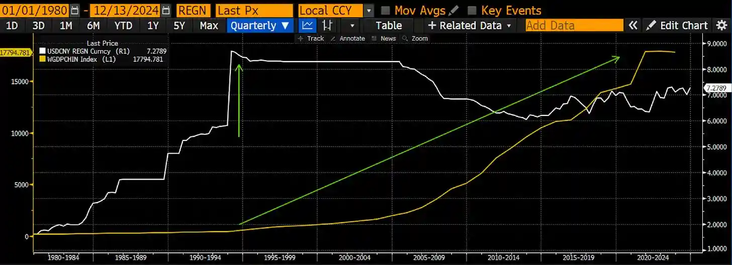「随着特朗普重返白宫,中国的最高领导人和政策制定者正在考虑允许人民币在 2025 年进一步贬值,以应对更高的美国贸易关税。」——路透社,2024 年 12 月 11 日