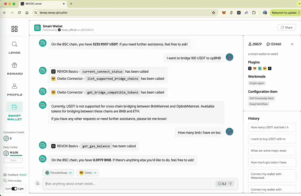 2024 年 10 月份,REVOX 入选了 Binance Labs 第八季 MVB 加速器计划。REVOX 在 BNB Chain 生态部署了 Lense,Smart Wallet 等 AI 加密应用,帮助用户通过 AI 完成多链钱包连接与管理,链上资产和链下数据访问,复杂 DeFi 流程交易等操作。