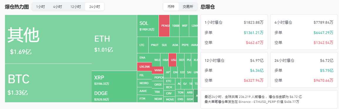 根据 Coinglass 数据,最近 24 小时,全球共有 236,199 人被爆仓,爆仓总金额为 $6.72 亿,最大单笔爆仓单发生在 Binance - ETHUSD_PERP 价值 $406.77 万。