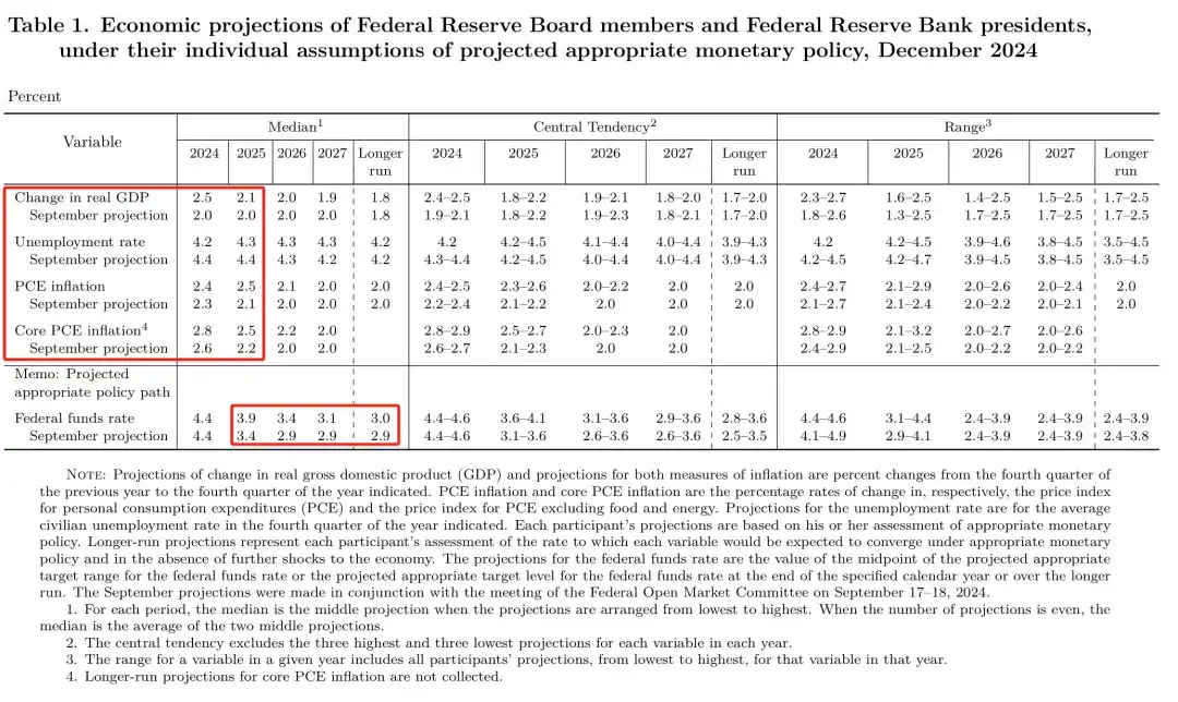 美联储主席杰罗姆·鲍威尔在新闻发布会上明确表示,尽管此次降息符合市场预期,但未来降息的频率和幅度可能远低于之前的市场假设。鲍威尔强调,2025 年美联储仅计划降息两次,此外还上调了 2025 年的通胀预期,从此前的 2.1% 提升至 2.5%。这一调整反映了美联储对未来通胀压力的深切担忧。