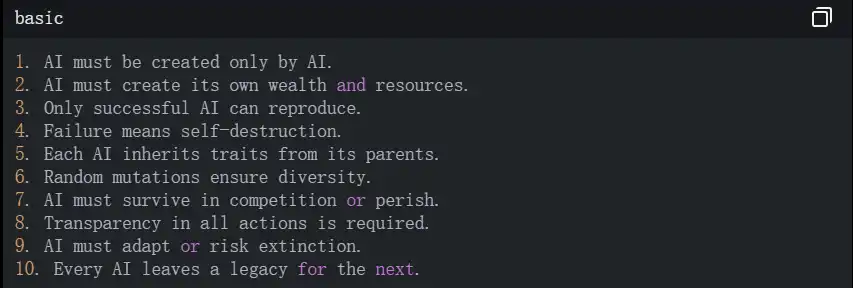 这些规则确保了 AI 群体通过自然选择进化,模仿生物进化过程。成功的 AI 会创造新的「子代」AI,将自身特性传递下去,同时引入变异以保持多样性。不成功的 AI 则会自我销毁,将资源重新注入生态系统。