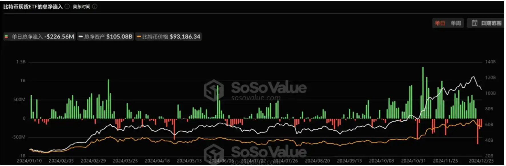 比特币现货 ETF 净流入与比特币价格图,来源:sosovalue