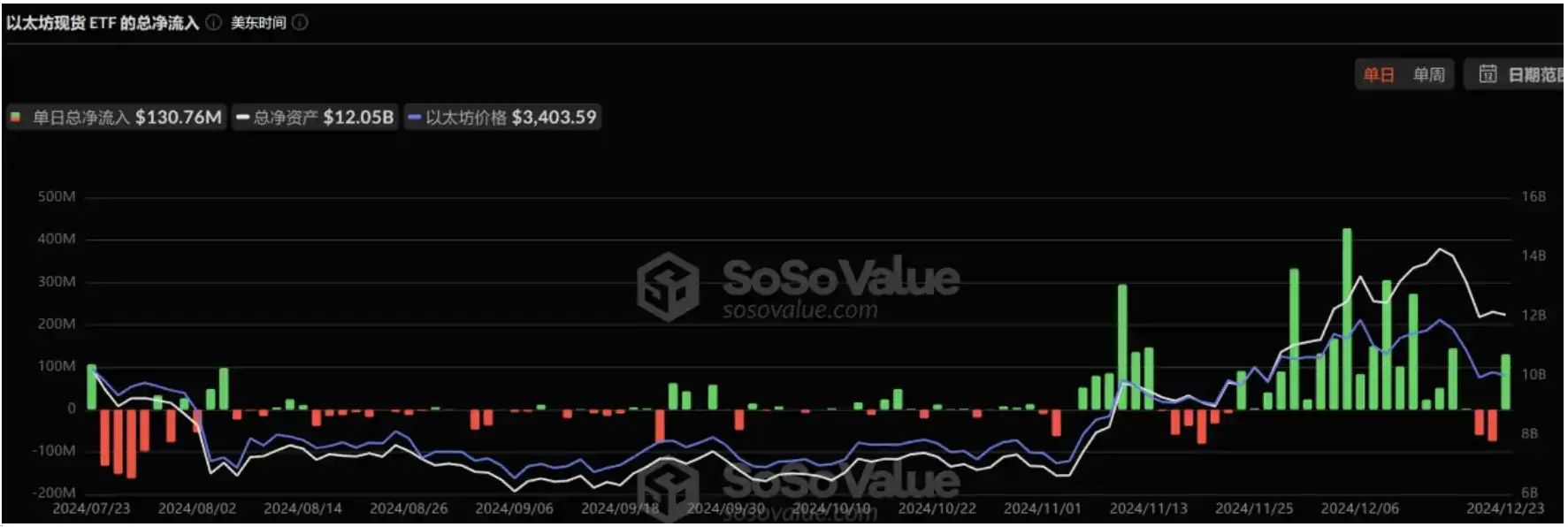 截至 12 月 24 日,美国以太坊现货 ETF 累计总净流入达 25.1 亿美元,总资产净值达 123.5 亿美元。在 12 月 5 日,净流入量达 4.28 亿美元,创下历史记录。