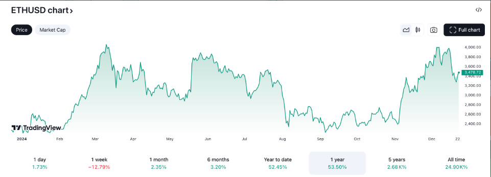根据 TradingView 数据,截至目前,ETH(以太币)今年以来已累计上涨 53.5%,从 1 月 1 日的 $2,350 上涨至当前的 $3,478。