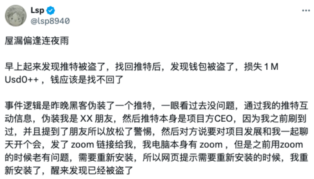 近期,X 上多位用户报告了一种伪装成 Zoom 会议链接的钓鱼攻击手法,其中一受害者在点击恶意 Zoom 会议链接后安装了恶意软件,导致加密资产被盗,损失规模达百万美元。在此背景下,慢雾安全团队对这类钓鱼事件和攻击手法展开分析,并追踪黑客的资金流向。