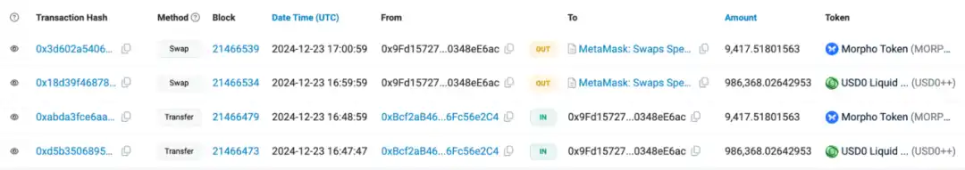 我们使用链上追踪工具 MistTrack 分析受害者提供的黑客地址 0x9fd15727f43ebffd0af6fecf6e01a810348ee6ac:黑客地址获利超 100 万美金,包括 USD0++、MORPHO 和 ETH;其中,USD0++ 和 MORPHO 被兑换为 296 ETH。