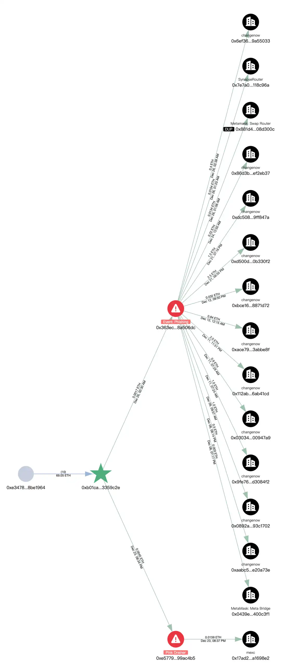 筛选该地址(0xb01c)转出对象中被标记为恶意的地址,关联到两个钓鱼地址,其中一个被标记为 Pink Drainer,扩展分析这两个钓鱼地址,资金基本转移到 ChangeNOW 和 MEXC。