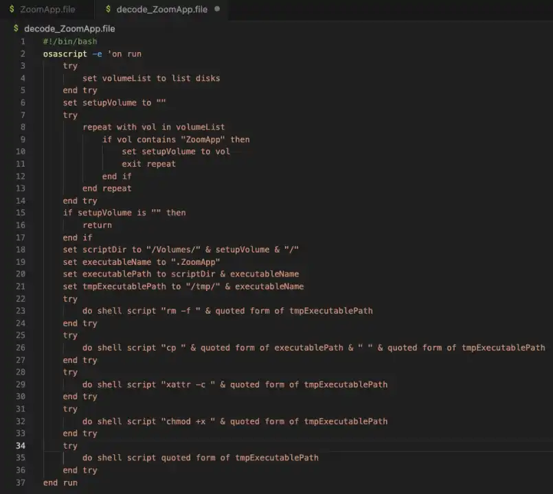 继续分析发现,该脚本查找一个名为「.ZoomApp」的隐藏的可执行文件并在本地运行。我们对原始安装包「ZoomApp_v.3.14.dmg」进行磁盘分析,发现安装包确实隐藏了一个名为「.ZoomApp」的可执行文件。