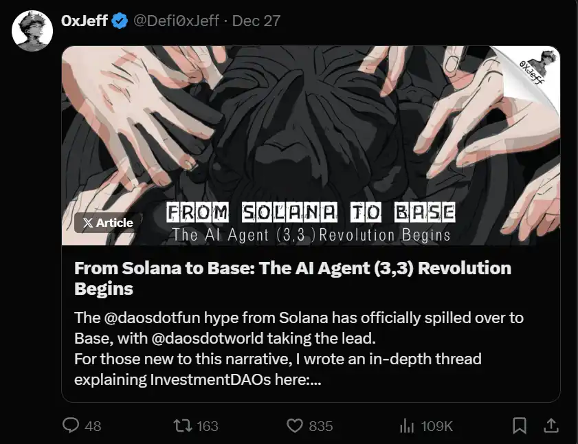 在十月,Virtuals 推出了 AI 代理代币化的概念。这是一次大胆的尝试,但说实话,大多数人并不关心,当时还太早。现在呢?Virtuals 的很多代理代币已经带来了 50 倍、100 倍的回报,突然间大家都开始关注了。