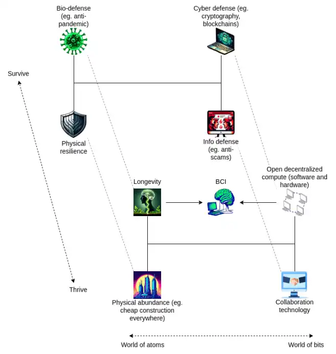 在我去年的文章中,d/acc 特别聚焦于防御性技术:物理防御、生物防御、网络防御和信息防御。然而,单纯的去中心化防御并不足以构建一个伟大的世界:我们还需要一个具有前瞻性的积极愿景,明确人类在获得新的去中心化和安全性之后能够实现何种目标。