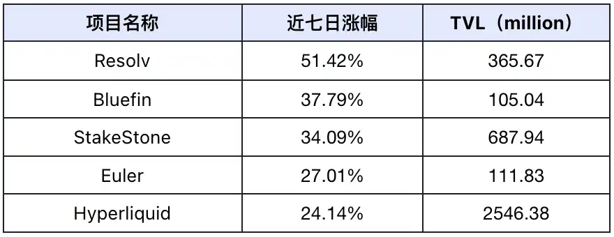 过去一周市场项目 TVL 涨幅前 5 名(未计入 TVL 较小的公项目,标准为 3000 万美元以上),数据来源:Defilama