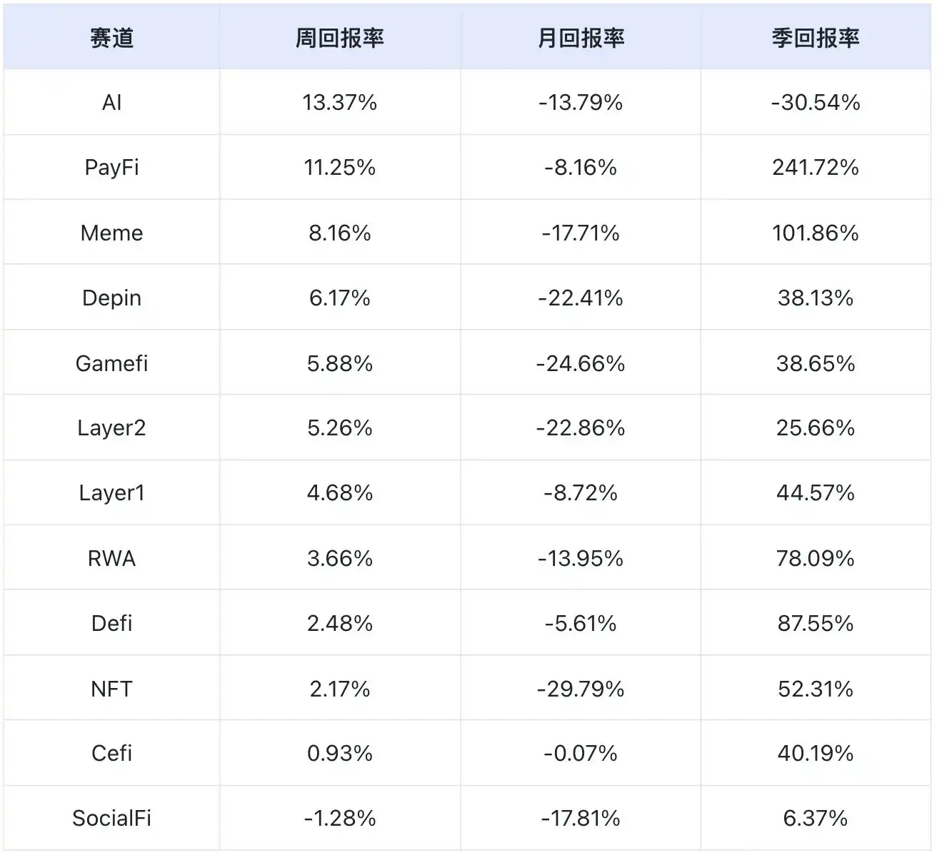 按周回报率统计,AI 赛道表现最佳,而 SocialFi 赛道表现最差。