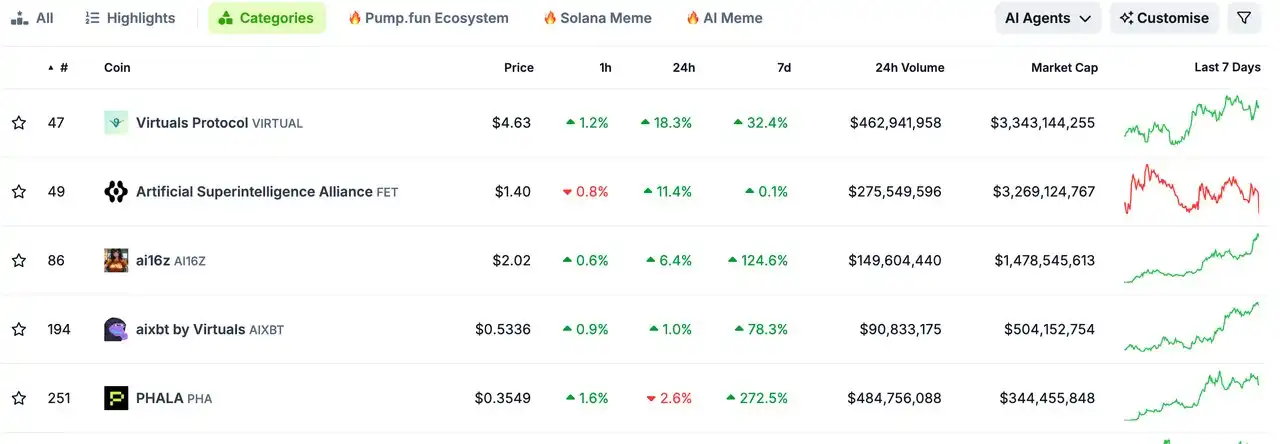 本周 AI Agent 赛道继续成为市场关注焦点还是因为 AI Agent 自主发币的原因,在本周通过 Virtuals 和 ai16z 发行的 Meme 币中一部分出现了大幅上涨的现象,制造了一定的财富效应,从而吸引市场上的投资者纷纷的将注意力和资金投入到 AI Agent 自主发币上。从涨幅中我们可以看出本周热度最高的是 ai16z 资产发行平台和 AI Agent 自主发币的基础设施建设项目—Phala Network。从而我们可以看出市场将注意力已经开始从 AI Meme 转向到了 AI infra 上。所以我们接下来要着重的关注一下 AI infra 赛道的项目。