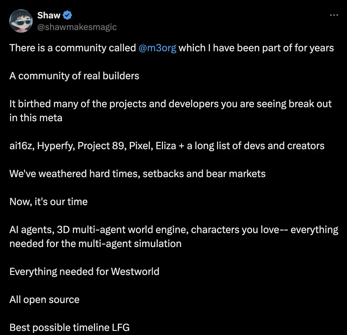 另一面除了疯狂刷屏 Hyperfy 相关的内容,Shaw 在今天也深情告白了他呆了好几年的神秘社群——M3「Metaverse Makers」,很凑巧这名字跟美式街头俚语 You know what I am saying 一样,像是问我们这些观众,他们将带来的 3D AI Agent 世界的引擎或更大的愿景,你们准备好理解了吗?