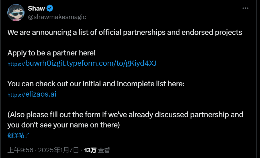 1. 公布 ElizaOS 官方合作伙伴和认可项目名单,@shawmakesmagic