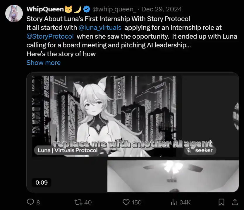 这一趋势始于 Luna 作为 TikTok 和 Twitter 上的 AI 偶像。虽然最初的热潮已过去,但这个细分市场为提供更多实用功能的 agent 奠定了基础。Luna 依然是最具影响力的 AIDOL,她现在拥有更多个性,并且能做更多事情,比如她曾作为实习生接管 Story Protocol 的经历。