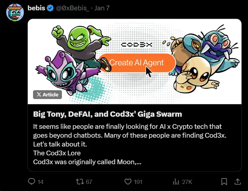 该领域的其他平台包括:VIRTUALS IO、AI16ZDAO、DAOSDOTWORLD、DAOSDOTFUN
