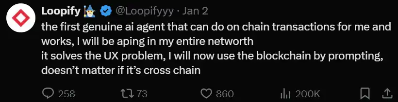 例如,一个完全自主的代理能够接受流动性资金,为其在加密市场上投资(既是顶级的高流动性交易者,又能参与 Echo 上表现最好的项目),同时收取比 ETF 或基金更低的费用。或者,一个代理能够在预测市场或体育博彩市场中实现超额收益。又比如,像 aixbt 这样的工具提供高价值的市场和投资研究。