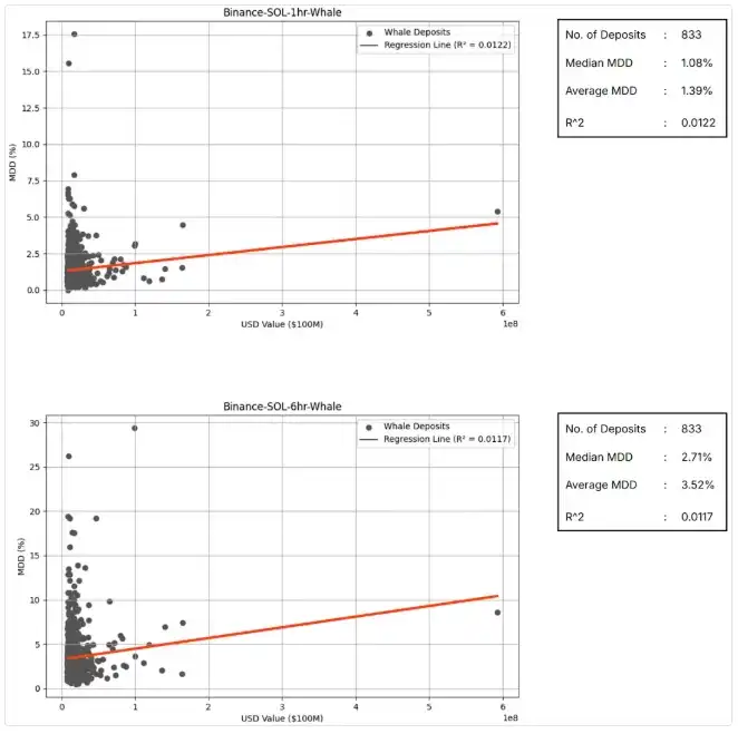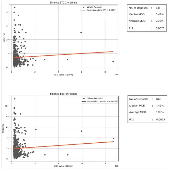 · 在链上确认大于阈值的存款后,抛售压力会在特定时间范围内显现。我们分析了两个时间段:一小时和六小时。