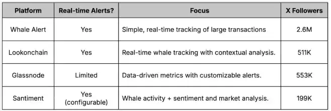主流的巨鲸警报服务,资料来源:Whale Alert、Lookonchain、Glassnode、Santiment、X、Presto Research