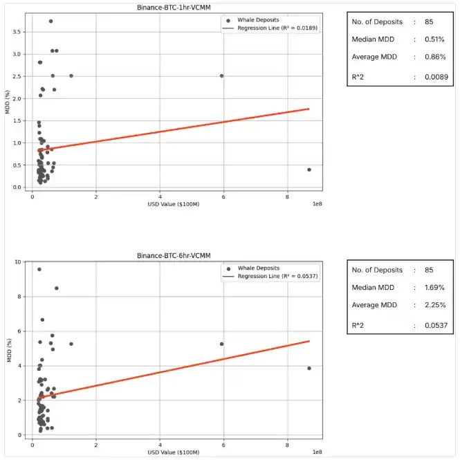 · 根据回归分析,大额交易存款与随后的价格变化之间的 R 平方值较低(从 0.0017 到 0.0537 不等)。将数据缩小到来自 VC 和 MM(做市商)的存款后略微提高了 R 平方值,但将它们作为交易信号的实际效用仍然有限。研究结果强烈表明,巨鲸向交易所存款缺乏作为可靠交易信号的预测能力。