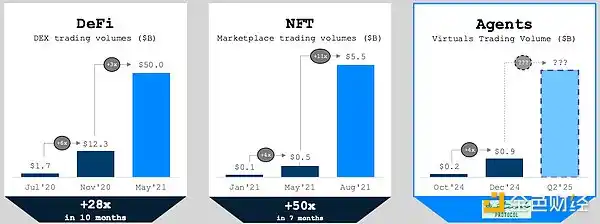 智能体的早期增长类似于 2020 - 2021 年 DeFi 和 NFT 的崛起;如果这一趋势继续下去,我们可能会看到代理在 2025 年上半年的月交易量达到 50 亿美元以上。