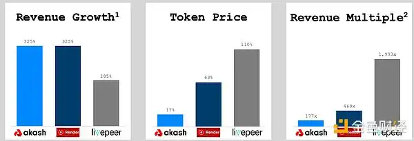 在三个有链上收入的去中心化 GPU 网络中,Akash 在收入倍数基础上既是增长最快的,也是估值最低的网络。
