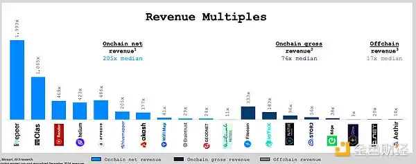 有链上收入的 DePIN 项目的估值中位数是净年度经常性收入(ARR)的 200 倍以上,而有链下收入的项目估值倍数则低于 20 倍。