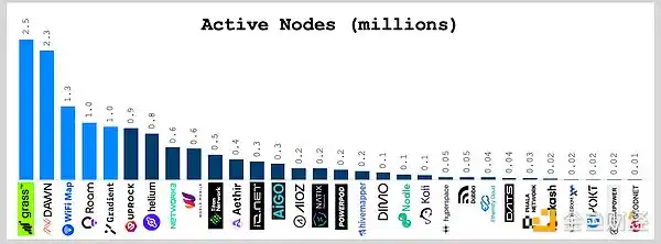 2024 年,有 20 个 DePIN 项目的活跃节点增长到超过 10 万个,其中 5 个项目的节点数量现已超过 100 万个。