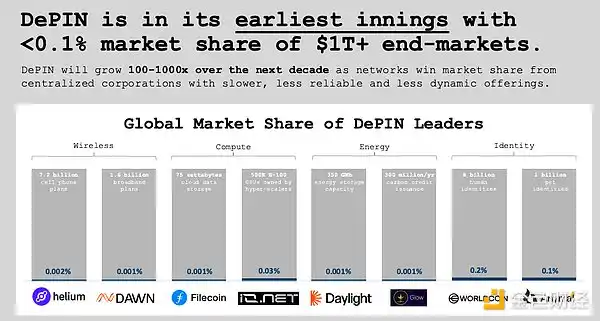 DePIN 处于早期阶段,在价值 1 + 万亿美元的终端市场中所占份额不到 0.1%。