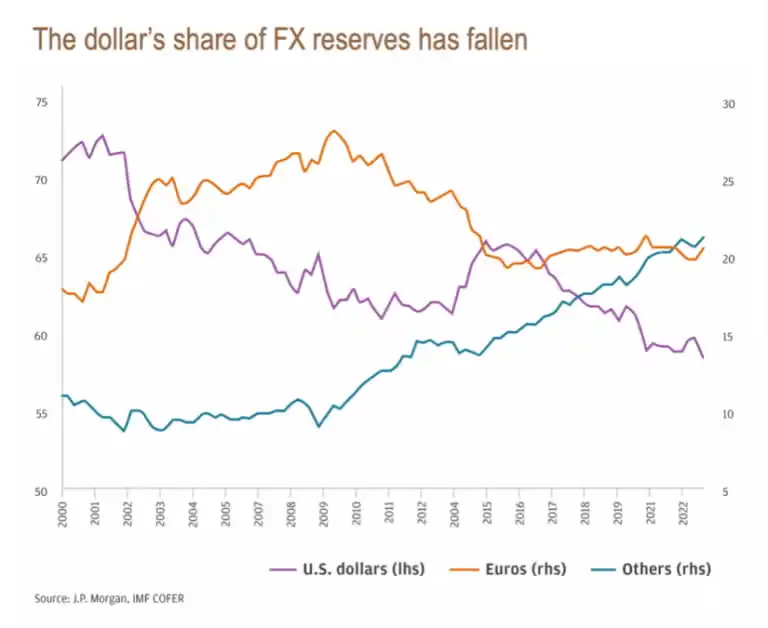 去美元化的趋势日益增长,指的是各国和机构在全球贸易和金融交易中逐渐摆脱美元的主导地位,这引发了关于美元长期统治地位的担忧。衡量美元主导地位的最常见标准是外汇储备中的美元份额,自 2000 年以来,该比例已经下降了 13 个百分点。