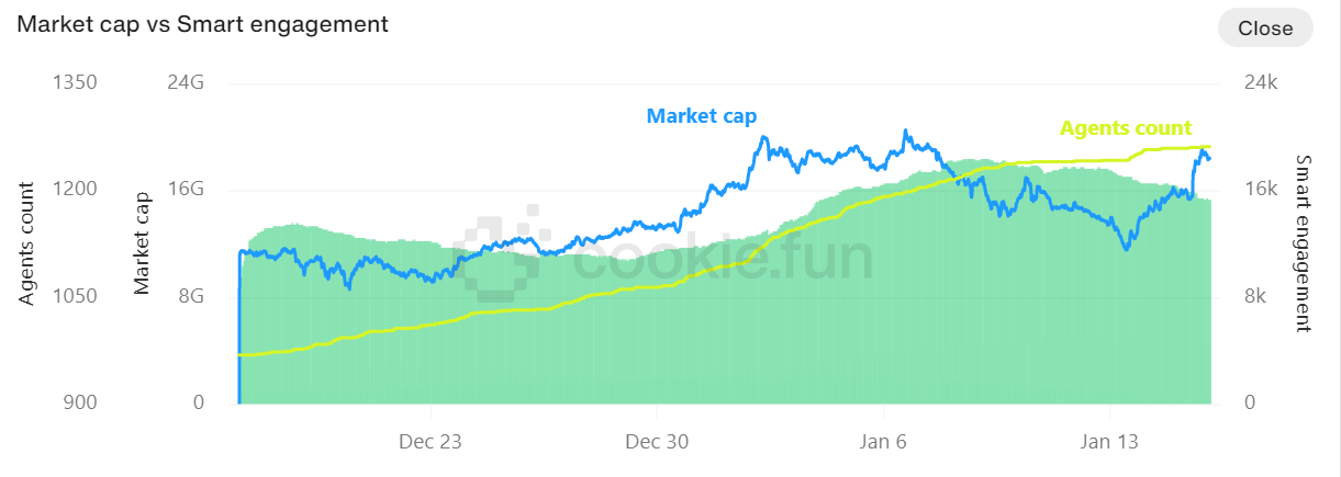 前几日,由于美联储降息预期的减少,美股首当其冲遭受影响,大盘出现了较为明显的下跌走势,13 日比特币一度跌破 9 万美元。AI Agent 板块热度也随之出现了一定程度的下降,其中,Buzz、ai16z、ARC、zerebro 等代币跌幅更是达到了惊人的 50% 左右。根据 cookie.fun 数据,AI Agent 市值从 6 日的 190 亿美元,下跌至 13 日最低约 115 亿美元,目前已反弹至近 184 亿美元。这一系列的变化,无疑是给此前持续火热的市场浇上了一盆冷水。
