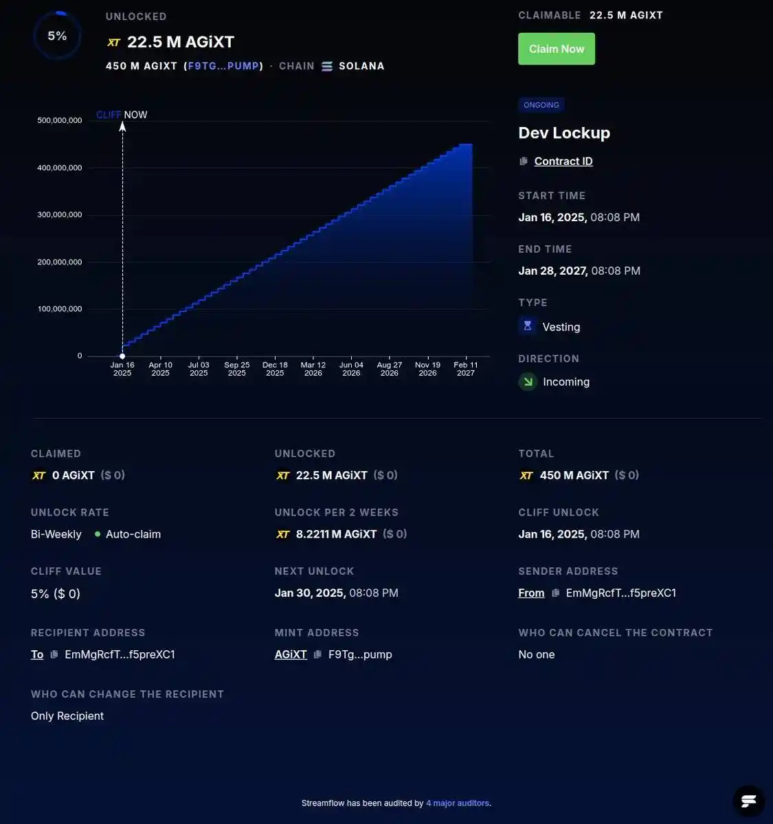 公开数据显示,他正在使用 Streamflow Finance 锁仓,将总量 450M 的 AGIXT 代币中的 5%(约 22.5M 个代币)进行为期两年的线性释放,从 2025 年 1 月 16 日开始,每两周自动解锁一次,直至 2027 年 1 月 28 日结束。