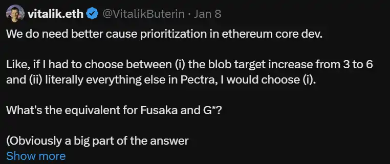 核心开发者知道这是关键问题。VitalikButerin 说将 Blob 数量从 3 增加到 6,比所有其他 Pectra 升级加起来都重要。但将容量翻倍只会给我们延长几个月,而不是几年。