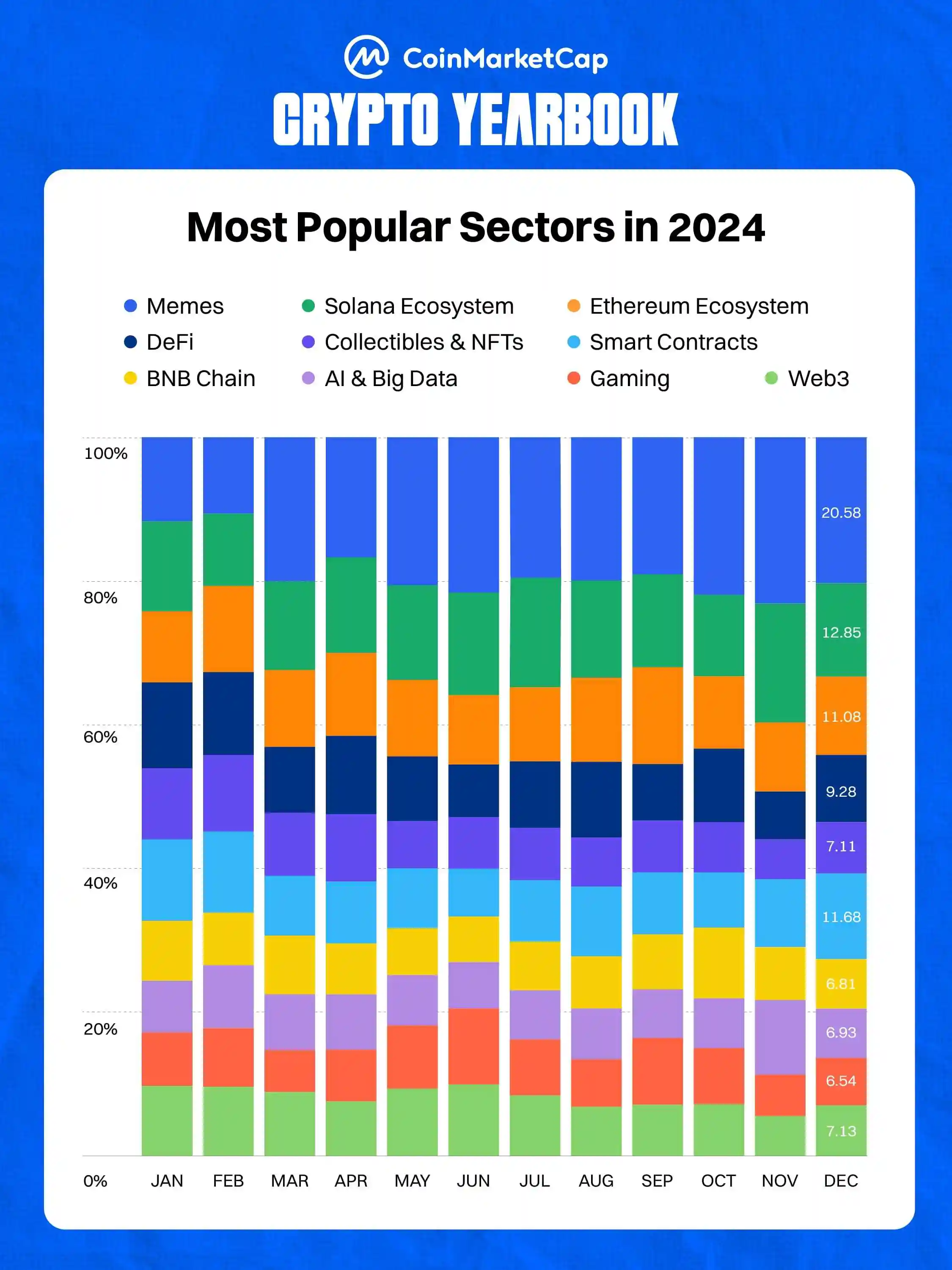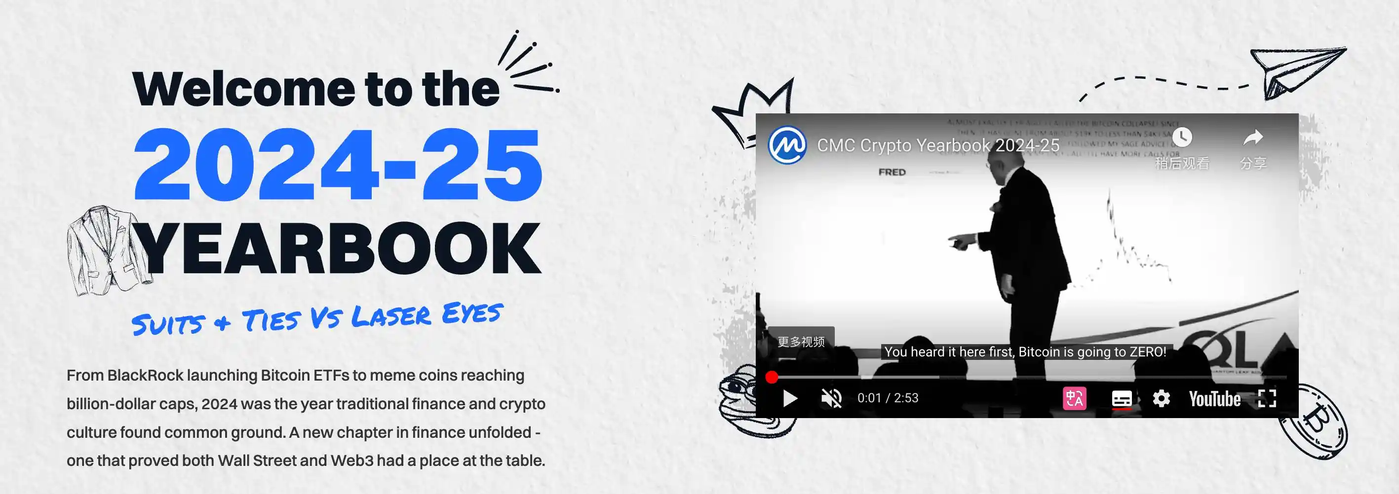 最近,CoinMarketCap 也发布了一份 2024-25 加密市场年鉴(Yearbook) ,梳理了过去 1 年的那些重大创新、震撼市场的时刻和令人难忘的里程碑,同时也对 25 年做了展望。