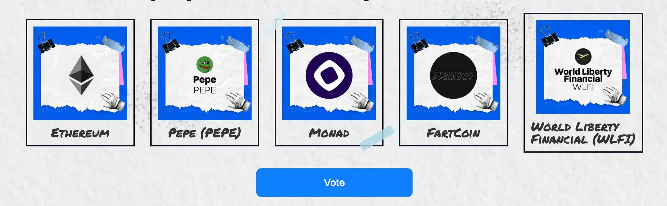 入选名单:ETH、PEPE、Monad、Fartcoin、World Liberty Financial (特朗普相关)。